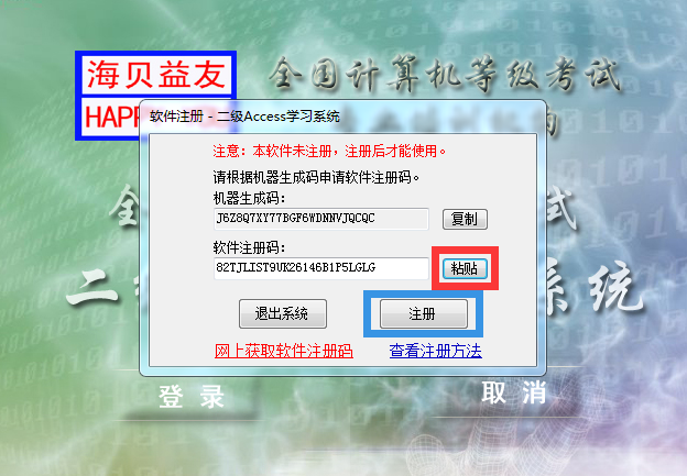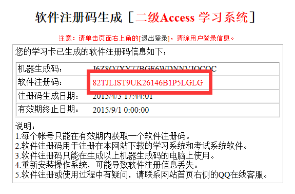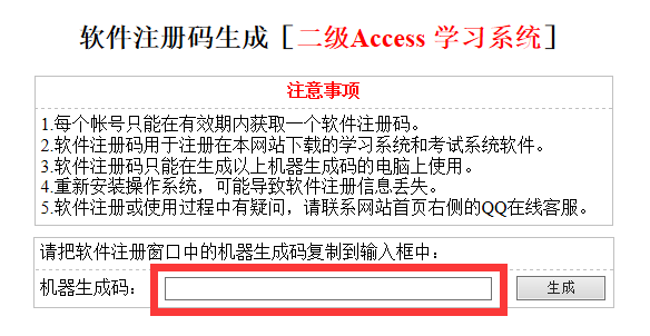 | 4. 在输入机器生成码网页中,在【机器生成码输入框】中单击【鼠标右键】,在弹出的菜单中选择【粘贴】,把第3步中复制的机器生成码粘贴在输入框中,单击【生成注册码】按钮,打开软件注册码信息网页。 注意:机器生成码必须是在你使用软件的电脑上生成的,学习系统和考试系统各自需要单独的账号注册。 |