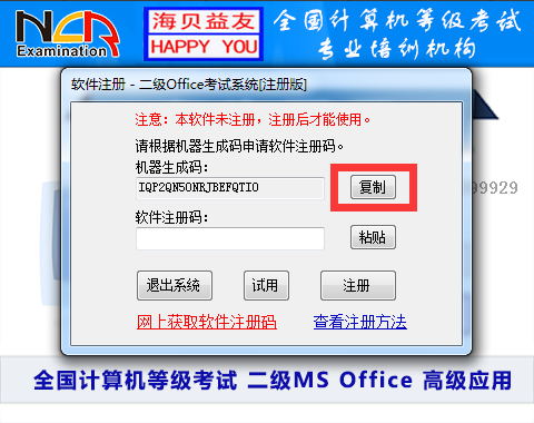| 3. 在软件注册窗口中,单击【复制】按钮,复制机器生产码。 |