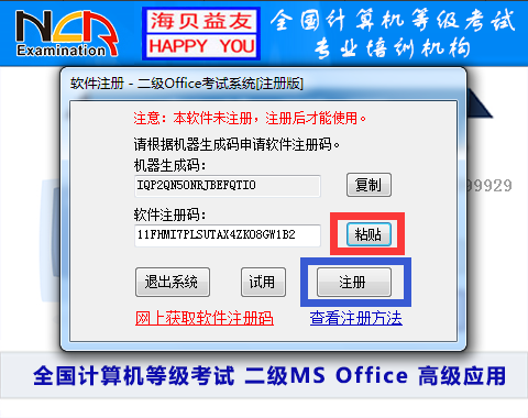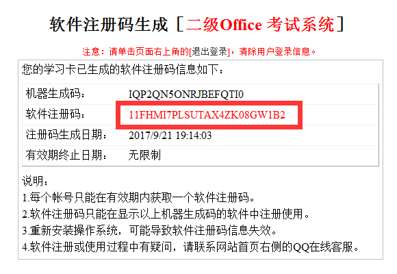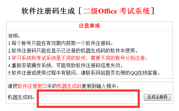 | 4. 在输入机器生成码网页中,在【机器生成码输入框】中单击【鼠标右键】,在弹出的菜单中选择【粘贴】,把第3步中复制的机器生成码粘贴在输入框中,单击【生成注册码】按钮,打开软件注册码信息网页。 注意:机器生成码必须是在你使用软件的电脑上生成的,学习系统和考试系统各自需要单独的账号注册。 |